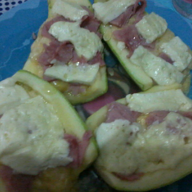Coloque a mistura nas abobrinhas. Acrescente presunto de peru picado e, depois, queijo minas picado. Regue azeite extra virgem.