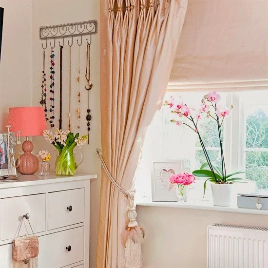 Candy colors, branco, flores, luz natural, tecidos leves, corações, bijus à mostra... um cantinho muito feminino.